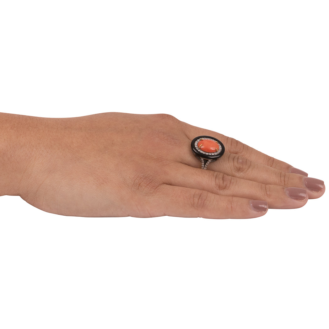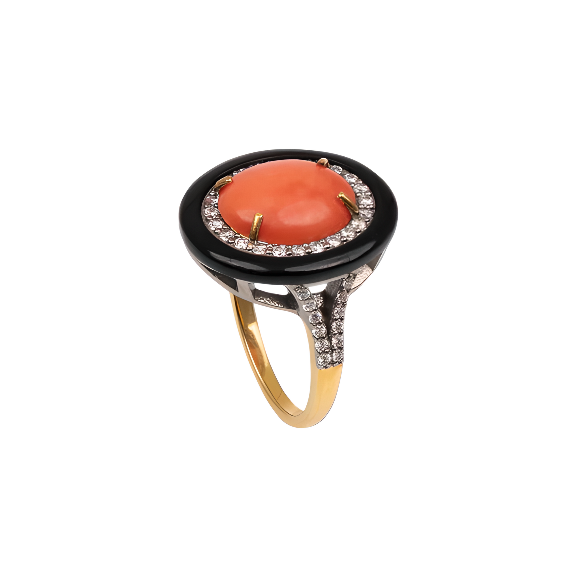 18kt Gold Plated Silver Coral, Onyx & Zircon Cocktail Ring
